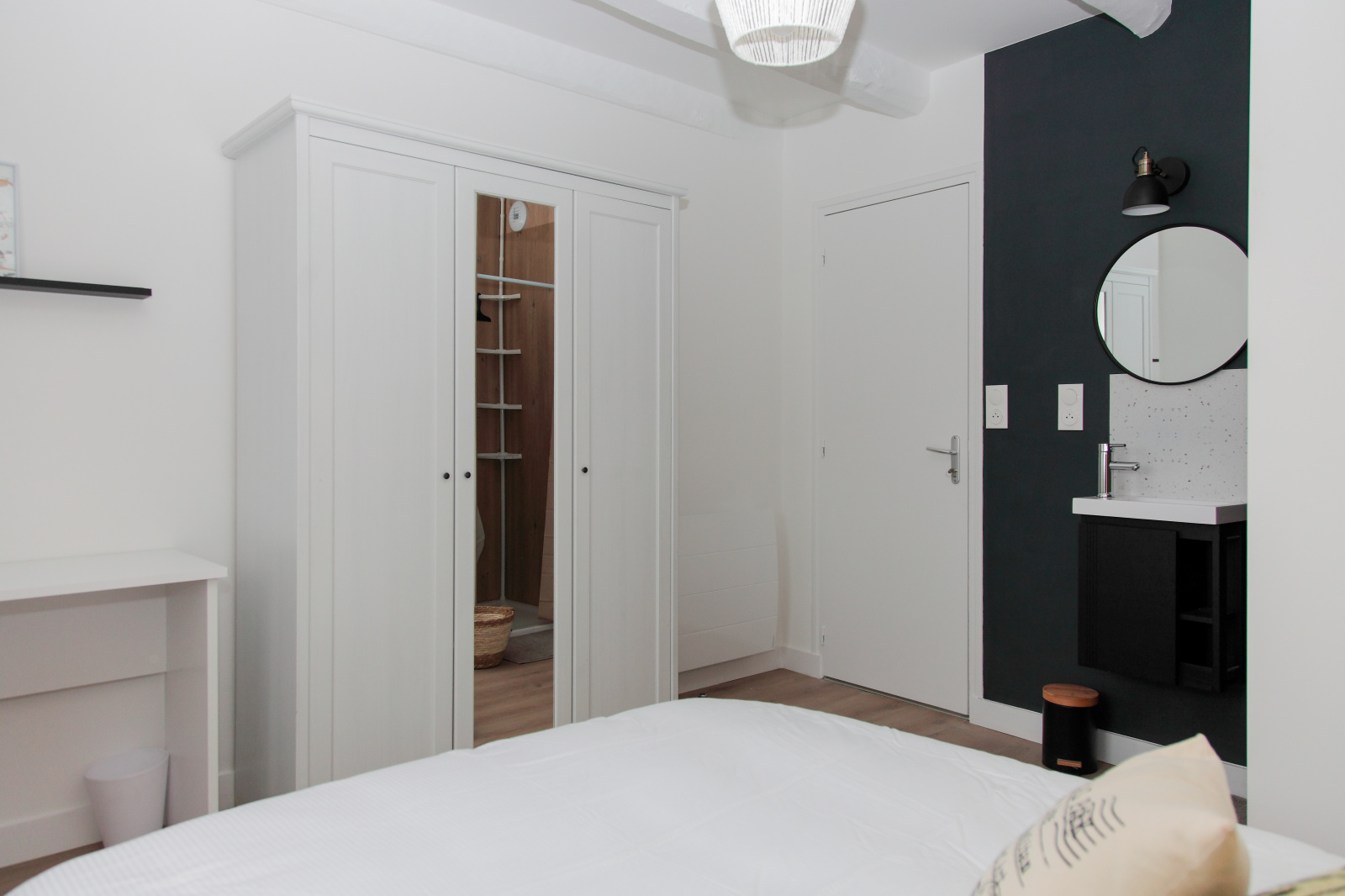 À l’étage, un palier menant à un dégagement avec espaces de rangement, deux chambres et une salle de bains avec WC.